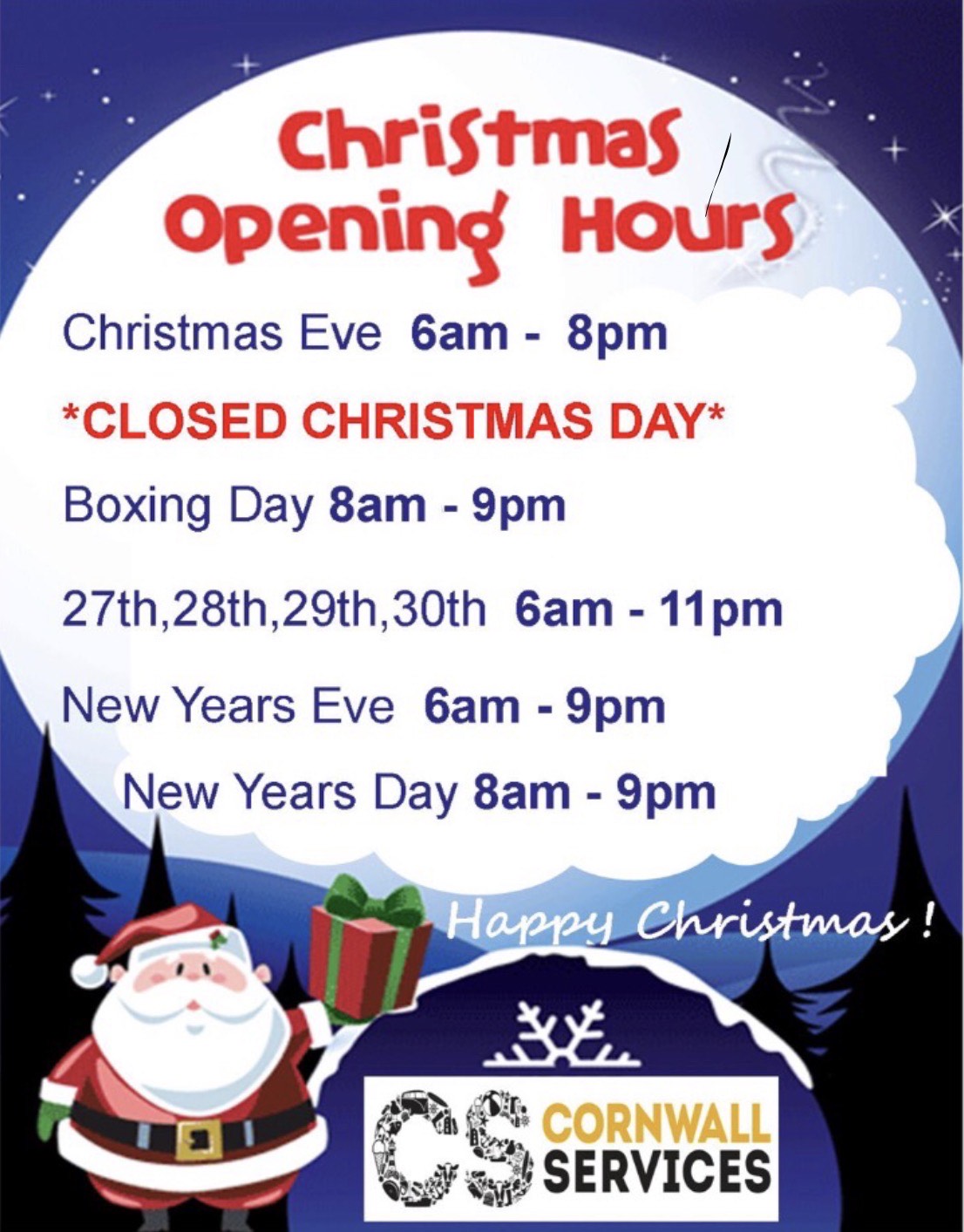 Christmas Opening Hours Here are our Christmas opening hours. Each outlet will have it’s own open/closing times so do check them, but this is for the main Cornwall Services site. Happy holidays when we get there and safe travels. 🥰 Posted: December 5, 2025 at 11:28 am